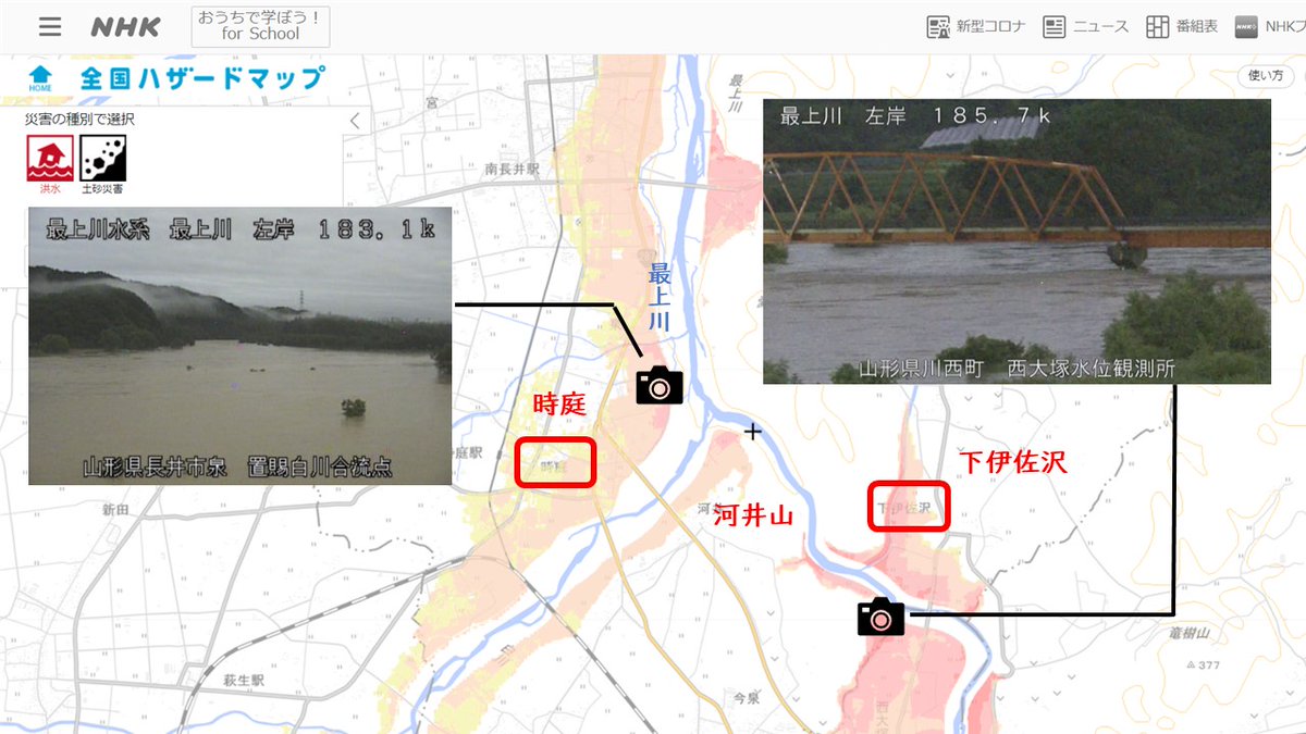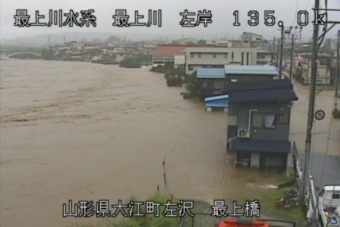 山形県長井市を流れる最上川上流に「氾濫発生情報」が発表されました。最上川右岸の長井市河井山付近では、すでに氾濫が発生し、川の水があふれ出して、浸水の危険が迫っています。