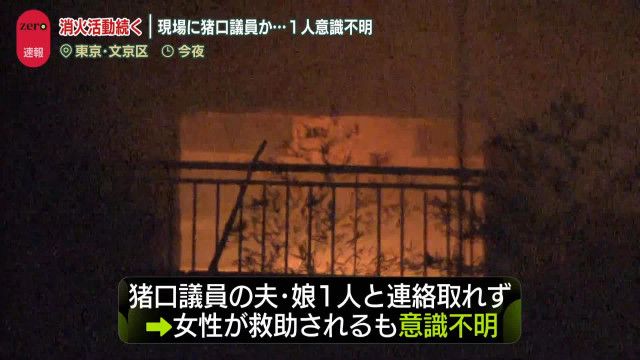 | 猪口邦子参議院議員の自宅で火事 2人死亡 夫・娘と連絡とれず 東京・文京区 …きのう夜、東京・文京区のマンションで火事があり、2人が死亡しました。火元の部屋は、猪口邦子参議院議員が住む自宅で、猪口議員の夫と娘と連絡がとれていないということです。 (出典:) |