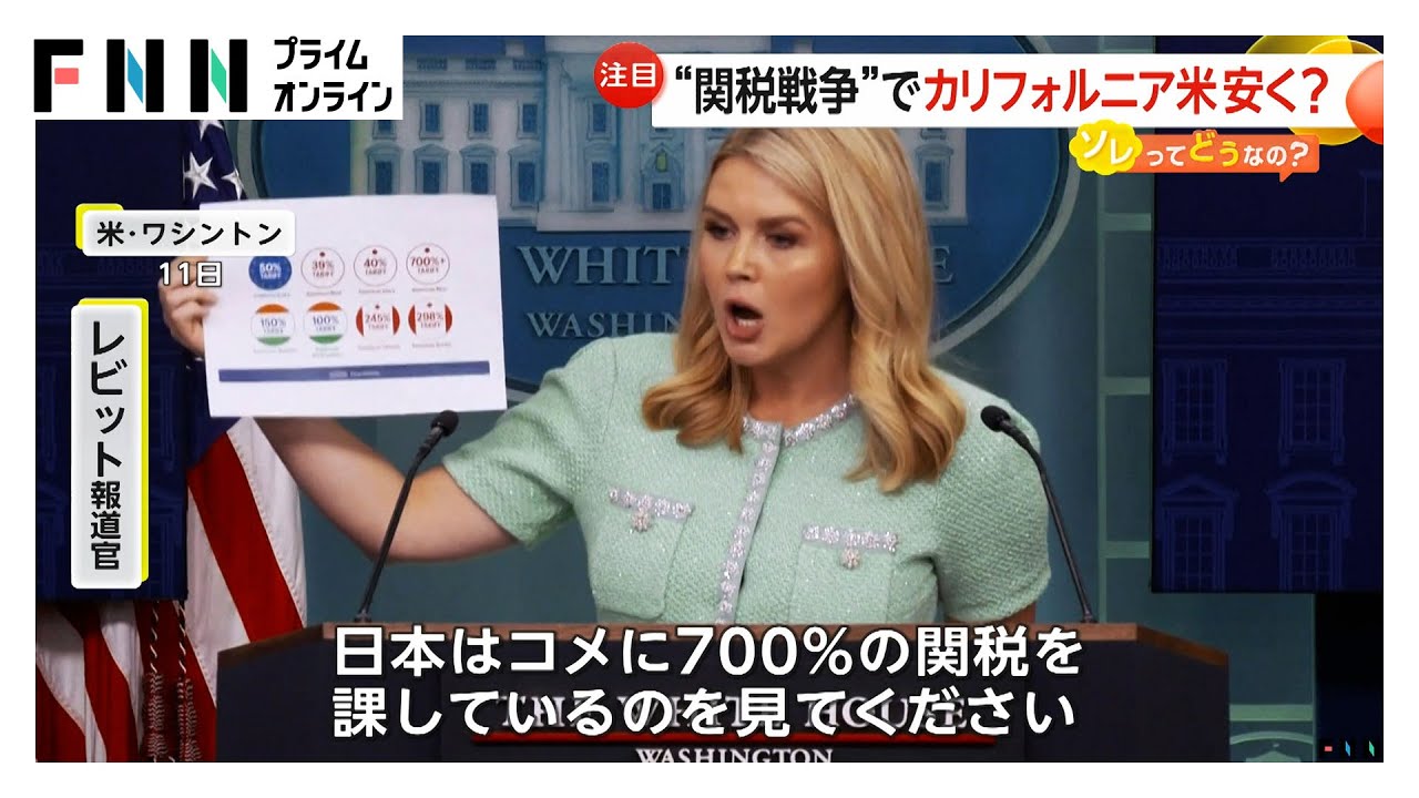 | 「日本は700%の関税課している」ホワイトハウス報道官が日本のコメ関税を批判 撤廃ならカリフォルニア産カルローズ米5kgが1295円に…農家に深刻打撃か …狙われたのは、日本が輸入米に掛けている関税だ。 12日のテーマは、「関税戦争でカリフォルニア米が安く?ソレってどうなの?」だ。 アメリカのレビット報道官はワシント… (出典:) |