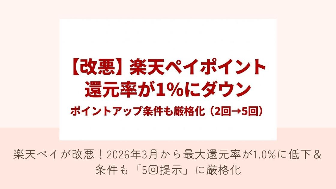 | 楽天ペイが改悪!2026年3月から最大還元率が1.0%に低下&条件も「5回提示」に厳格化 …楽天ペイユーザーに衝撃のニュースです。 これまで条件を満たせば1%~1.5%還元とスマホ決済サービスの中でもポイント還元の高さが魅力だった楽天ペイで… (出典:しょうこちゃん) |